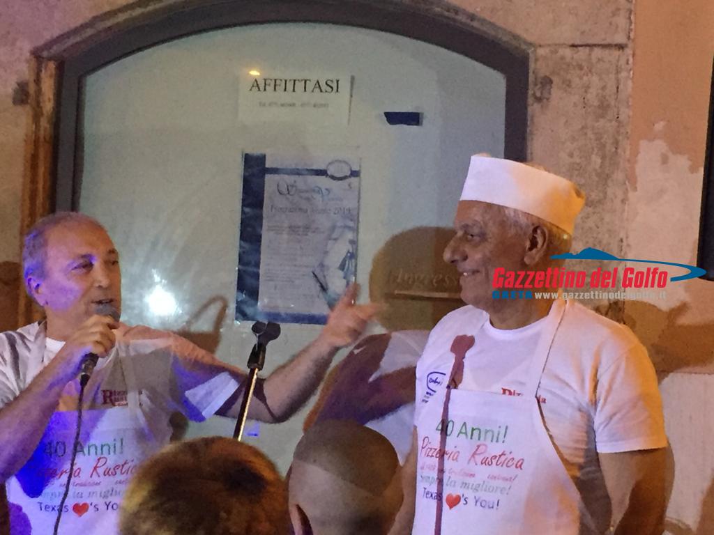 Allietati dall’intrattenimento di Marco e Alfredo i molti presenti sono strati travolti dall’entusiasmo contagioso di Roby che si è cimentato in varie performance musicali. Durante la serata il ricordo degli albori della pizzeria, attraverso le parole di Roby, ha emozionato i presenti: “Questa non era la mia vita, io ero giovanotto, giravo il mondo in moto. Noi eravamo ragazzi di campagna, andavamo a scuola insieme, poi, nel 1979, quando Antonio ha sposato mia sorella, mia madre mi disse “questo è il tuo sangue, è la cosa più bella che c’è, non te lo dimenticare”. Visto che Antonio mi disse “vieni a lavorare con me” per rispetto ai miei genitori ho dato qualcosa di più a questa mia famiglia e qualcosa a questa città. Mi sono dedicato con il cuore a fare tutto… che non è poco. Abbiamo iniziato con tanti sacrifici, facendo 20km al giorno, non è una cosa semplice. Abbiamo iniziato la nostra storia in un locale sotto le scale, siamo arrivati qua e con il tempo ora facciamo tante belle cose. Vedete me l’immagine, ma dietro di me c’è un lavoro immenso che impegna 12/13 persone“.