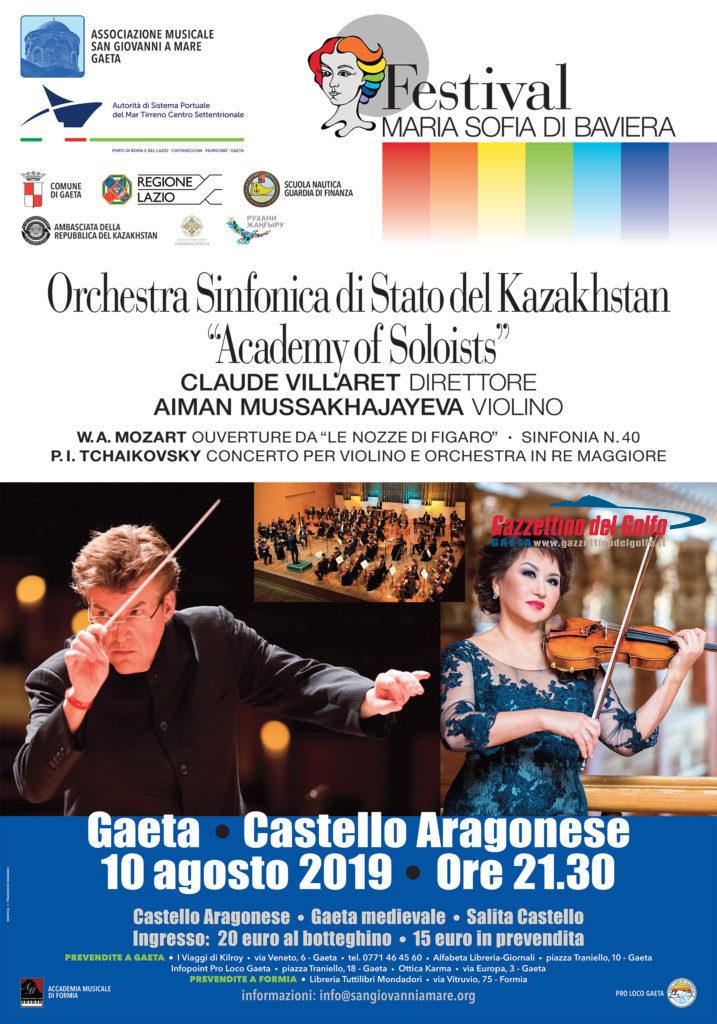 Organizzato dall’Associazione Musicale San Giovanni a Mare di Gaeta in collaborazione con l’Autorità di Sistema Portuale del Mar Tirreno Centro-Settentrionale e il patrocinio del Comune di Gaeta, sabato 10 agosto si svolge a Gaeta un Festival musicale dedicato alla “Eroina di Gaeta” Maria Sofia di Baviera con la partecipazione dell’Orchestra Sinfonica di Stato del Kazakistan che esegue l’Ouverture dalle Nozze di Figaro e la Sinfonia n. 40 di Mozart e il Concerto per violino e orchestra in re maggiore di Tchaikovsky.