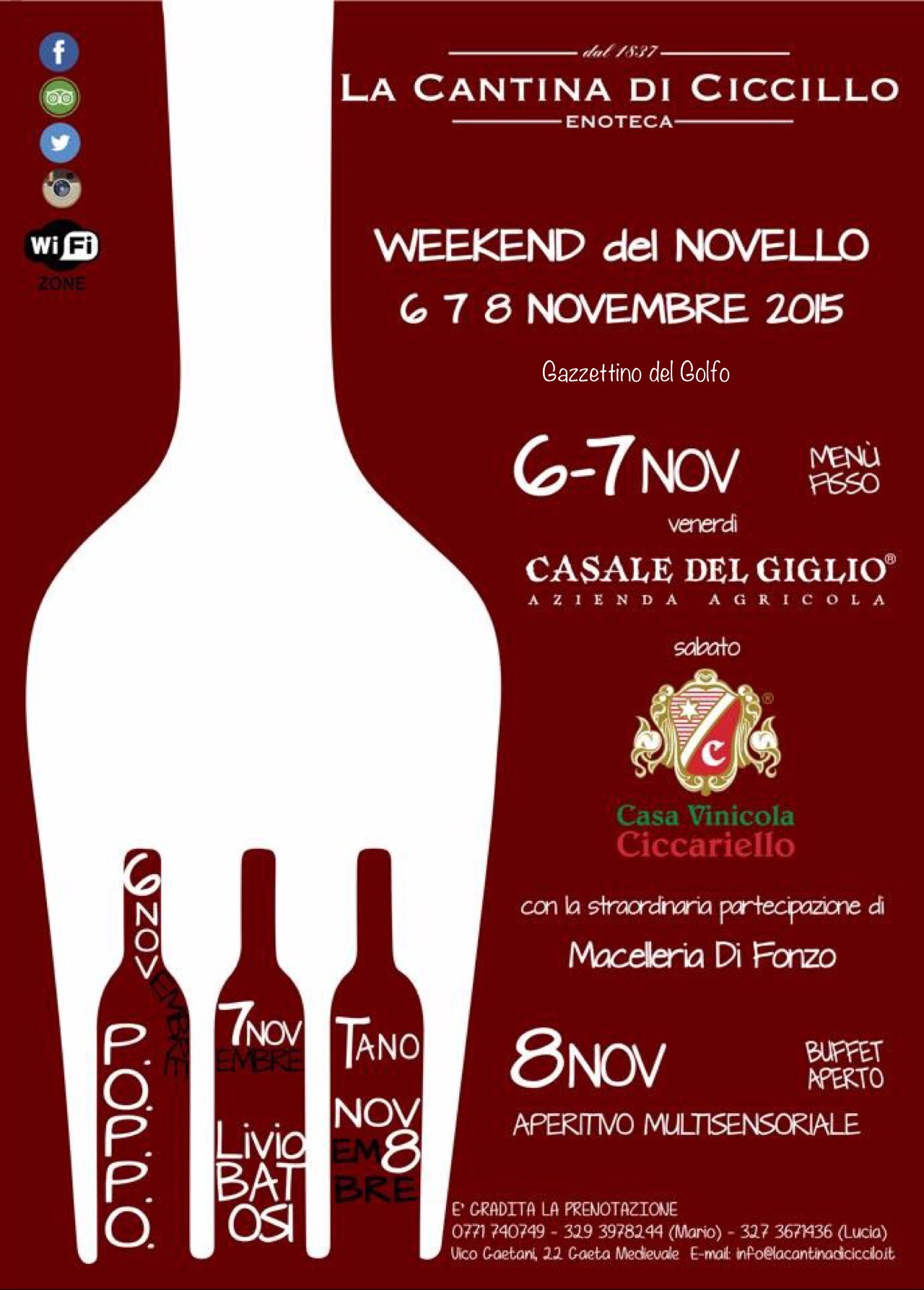 Per info e prenotazioni 0771 740749 – 329 3978244 (Mario) – 327 3671436 (Lucia) Vico Gaetani 22 Gaeta Medievale mail: info@lacantinadiciccillo.it.