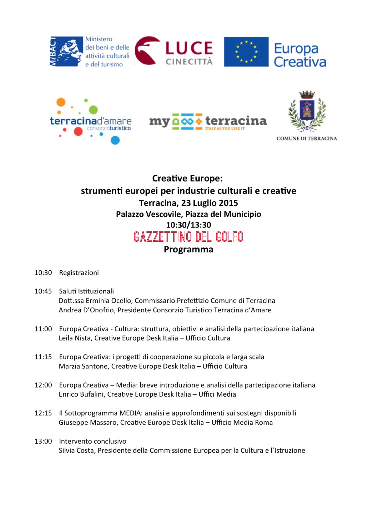 Introdurranno i lavori la Dott.ssa Erminia Ocello, Commissario Prefettizio del Comune di Terracina e Andrea D’Onofrio, Presidente Consorzio Turistico Terracina d’Amare, Silvia Costa, Presidente della Commissione Europea per la Cultura e l’Istruzione.