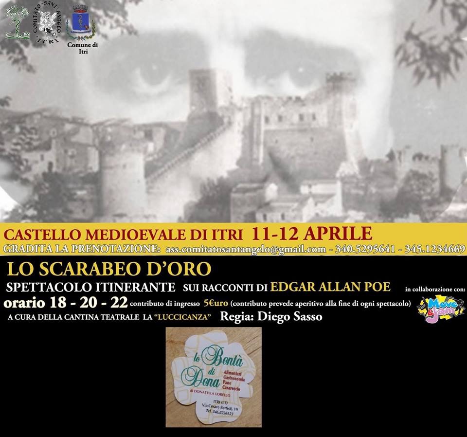 Nel fine settimana dell’11-12 aprile presso il Castello Medioevale di Itri si terrà lo spettacolo itinerante “Lo Scarabeo D’oro“, sui racconti di Edgar Allan Poe. L’evento, a cura della cantina teatrale la “Luccicanza“, è suddiviso in tre orari differenti: 18, 20 e 22 e prevede un contributo di ingresso pari a 5€, con annesso aperitivo alla fine di ogni spettacolo.
