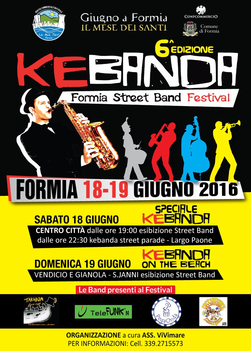Un’organizzazione a cura dell’Associazione ViVimare promossa in collaborazione con l’Associazione “Le Due Torri” Centro Commerciale Naturale patrocinata dal Comune di Formia e dalla Confcommercio territoriale di Formia prevede due giorni di musica e divertimento. Il programma delle due giornate del Kebanda Formia SBF: Sabato 18 dalle ore 19,00 fino alle 21,00 classico street parade su tutto il centro cittadino, coinvolgimento di 5 piazze con oltre 20 spettacoli itineranti. Allo shopping serale sarà abbinato la festosa e gioviale spensieratezza e allegria musicale delle street band.Dalle ore 22,30 street parade ed intrattenimento itinerante nella centralissime Largo Paone, Via Tulli Via A. Tosti con spettacoli individuali e collettivi, nei locali più in voga della movida Formiana.