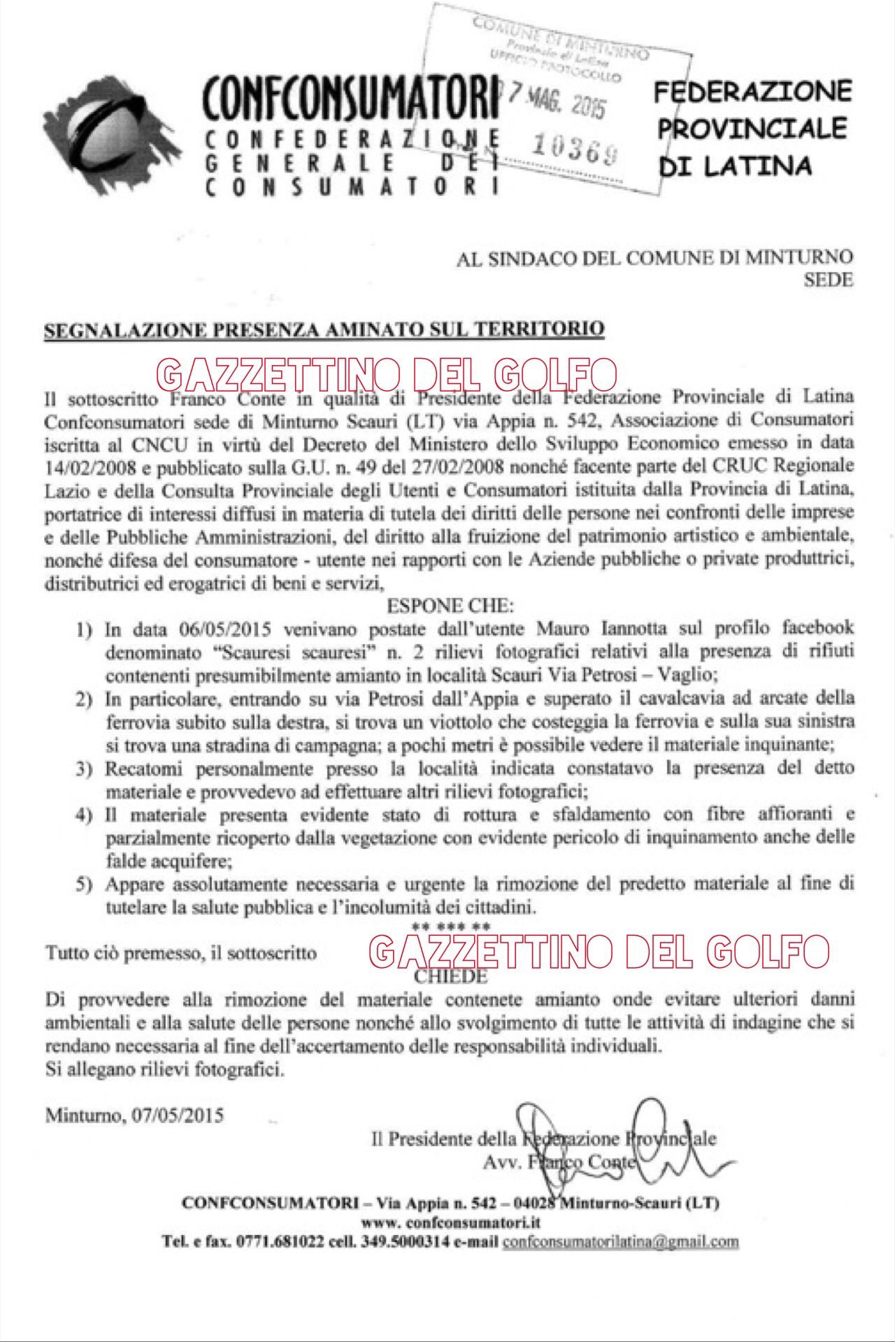 Il sottoscritto Franco Conte in qualità di Presidente della Federazione Provinciale di Latina Confconsumatori sede di Minturno Scauri (LT) via Appia n. 542, Associazione di Consumatori iscritta al CNCU in virtù del Decreto del Ministero dello Sviluppo Economico emesso in data 14/02/2008 e pubblicato sulla G.U. n. 49 del 27/02/2008 nonché facente parte del CRUC Regionale Lazio e della Consulta Provinciale degli Utenti e Consumatori istituita dalla Provincia di Latina, portatrice di interessi diffusi in materia di tutela dei diritti delle persone nei confronti delle imprese e delle Pubbliche Amministrazioni, del diritto alla fruizione del patrimonio artistico e ambientale, nonché difesa del consumatore – utente nei rapporti con le Aziende pubbliche o private produttrici, distributrici ed erogatrici di beni e servizi,