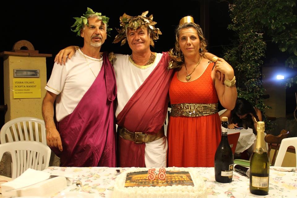 “Per dare un tono di classe alle mie 58 primavere ho voluto festeggiare con una serata a tema, un dress code, nello specifico …. S.P.Q.R. … Ci siamo molto divertiti e con gratificante soddisfazione facciamo sapere alle persone ‘vicine e lontane’ che a Itri si ci diverte con gusto e finezza, in quanto non ci riteniamo e non siamo per nulla dei provincialotti!” E’ la voce del festeggiato, Claudio Pelliccia, 58 anni sabato 11 luglio, a introdurre la notizia dell’evento che segna l’inizio, a Itri, e in molti giurano che il contagio positivo si diffonderà a macchia d’olio, di questo tipo di aggregazione festosa, che contorna ricorrenze di nascite ma che può accompagnare altre occasioni simpatiche per brindare e gioire insieme. Magari al cronista potrà forse essere sfuggita qualche altra serata di questo genere che si è tenuta a Itri, ma la coerente decisione di metterci la faccia conferisce a Pelliccia, noto imprenditore nel settore della vendita delle bevande, la primogenitura nella pratica di protocolli festosi di questo genere. Contornato dalla moglie Antonella, dalle due figlie Civita e Giorgia (che vediamo affiancarlo nella foto a quattro) e da amici di vecchia data, il protagonista della serata ha saputo raccogliere plausi rivoltigli personalmente o a mezzo del canale Facebook, sia dalla gente del posto, che da tanti conoscenti che lo hanno salutato con un particolare augurio telematico dall’Italia e dall’estero.