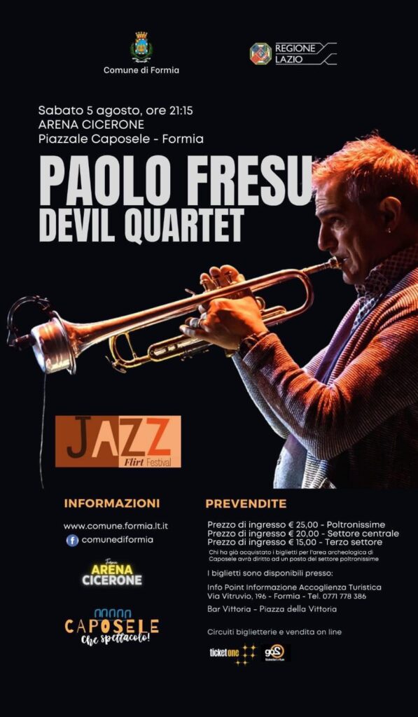 L’inaugurazione dell’Arena Cicerone vedrà salire sul palco il noto trombettista Paolo Fresu con il suo Devil Quartet, una formazione celebrata a livello europeo con una line up che mette insieme autentici specialisti dei loro strumenti. La regia sapiente di Fresu governa una musica che lui stesso definisce “melangé”, frutto di incroci di stili e linguaggi diversi, intensa, aperta, innovativa con un repertorio che spazia dalle composizioni originali dei componenti del quartetto alla rielaborazione di pagine che fanno parte del songbook jazzistico condiviso. Il suo live è inserito all’interno del penultimo appuntamento della XIX edizione del Jazzflirt Festival, la kermesse in collaborazione con l’Associazione Jazzflirt Musica & Altri Amori e parte integrante di “Caposele…che spettacolo”, promossa dall’assessorato alla Cultura con il contributo della Regione Lazio.