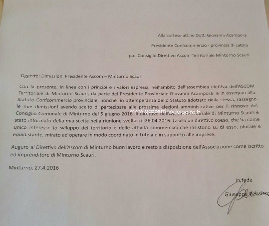 “Avendo scelto di partecipare alle prossime elezioni comunali rassegno le mie dimissioni da Presidente dell’Ascom di Minturno-Scauri”