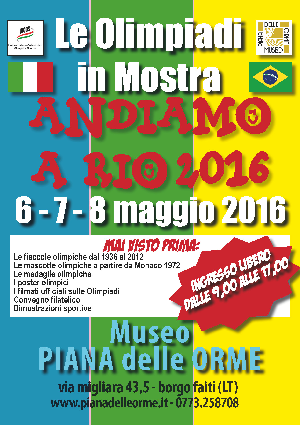 Il Museo storico Piana della Orme – Borgo Faiti con la collaborazione del Circolo Filatelico “Tres Tabernae” di Cisterna di Latina e l’Unione Italiana Collezionisti Olimpici e Sportivi ha organizzato in occasione dei Giochi Olimpici di Rio de Janeiro, dal 6 all’8 maggio 2016 un’esposizione di filatelia (con partecipazioni internazionali) e memorabilia sport-olimpiche presso la sede del Museo Piana delle Orme a Borgo Faiti.