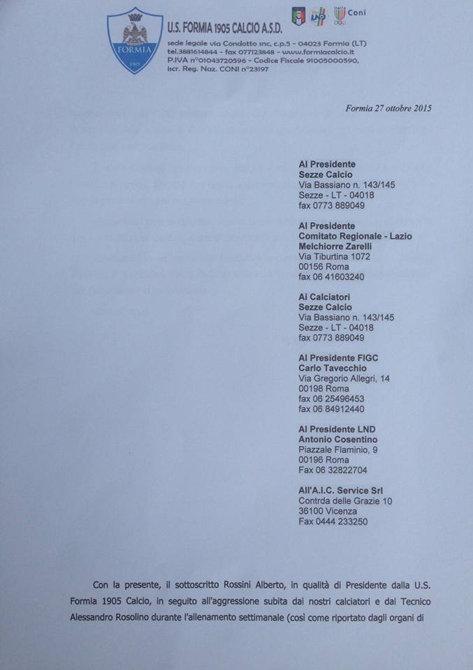 Il Formia Calcio 1905, attraverso il proprio presidente Alberto Rossini, dopo l’aggressione di ieri, durante l’allenamento settimanale, subita dai calciatori e dal tecnico Alessandro Rosolino, chiede alla Società Calcio Sezze, di poter rinviare la gara di campionato prevista per domenica 1° novembre.