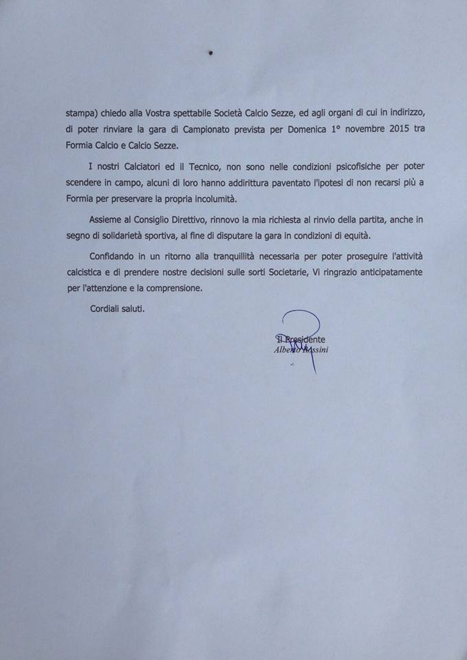 “I nostri calciatori e il tecnico non sono nelle condizioni psicofisiche per poter scendere in campo, alcuni di loro hanno addirittura paventato l’ipotesi di non recarsi più a Formia per preservare la propria incolumità. Assieme al Consiglio Direttivo, rinnovo la mia richiesta al rinvio della partita, anche in segno di solidarietà al fine di disputare la gara in condizioni di equità”.