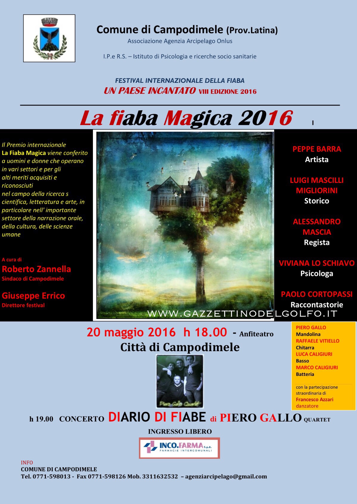 è un festival internazionale sulla narrazione orale ideato dallo psicologo Giuseppe Errico e dedicato ai bambini e a tutti coloro che amano le fiabe. L’iniziativa è promossa e coordinata dal Comune di Campodimele, dall’associazione Agenzia Arcipelago onlus di Napoli e dall’Associazione I.P.ER.S. (Istituto di psicologia e ricerche socio sanitarie) di Formia. Questo ottavo appuntamento viaggia attraverso il borgo della città, i vicoli, le piccole piazze e la cinta muraria. L’obiettivo è trasformare uno scenario naturale in un paese magico attraverso una ricca programmazione di storie, animazioni, racconti, laboratori, teatro e spettacoli. Ricco il programma proposto ai visitatori, programma che agli spettacoli unisce attività didattiche, incontri, workshop, mostre e laboratori espressivi sulla fiaba a cura di artisti, disegnatori, mimi, animatori, illustratori e giocolieri. Nell’ambito del festival saranno premiati, con il riconoscimento denominato “La fiaba magica”, l’attore e regista PEPPE BARRA, lo storico LUIGI MASCILLI MIGLIORINI, il raccontastorie PAOLO CORTOPASSI, l’attore e regista ALESSANDRO MASCIA (Cada die teatro) impegnato in progetti di teatro sociale (Migranti, Teatricontroesclusione) e la psicologa VIVIANA LO SCHIAVO.