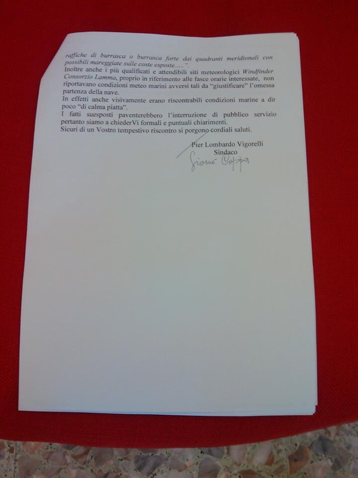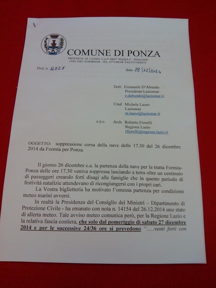 “Si faccia chiarezza” è questo che chiede a gran voce il sindaco di Ponza Piero Vigorelli. L’Amministrazione comunale, ha infatti inviato una missiva alla società che gestisce i collegamenti con le isole pontine, nella quale si chiede che venga fatta luce sulla soppressione del traghetto Formia – Ponza delle 17:30 del 26 dicembre scorso; per la società Laziomar potrebbe configurarsi l’interruzione di pubblico servizio.