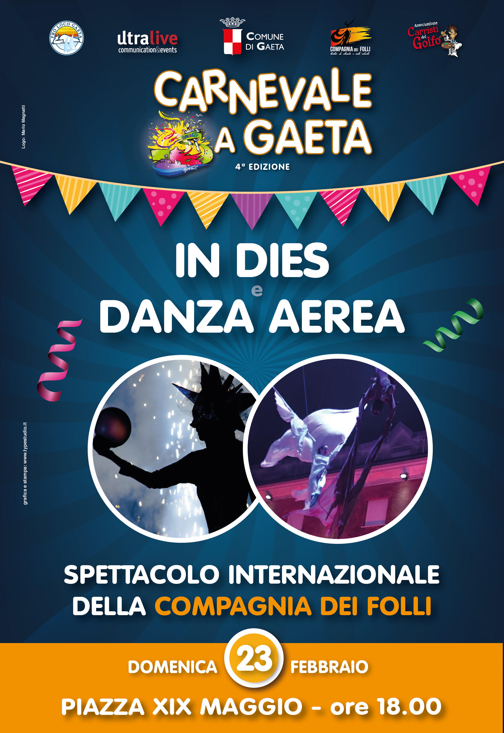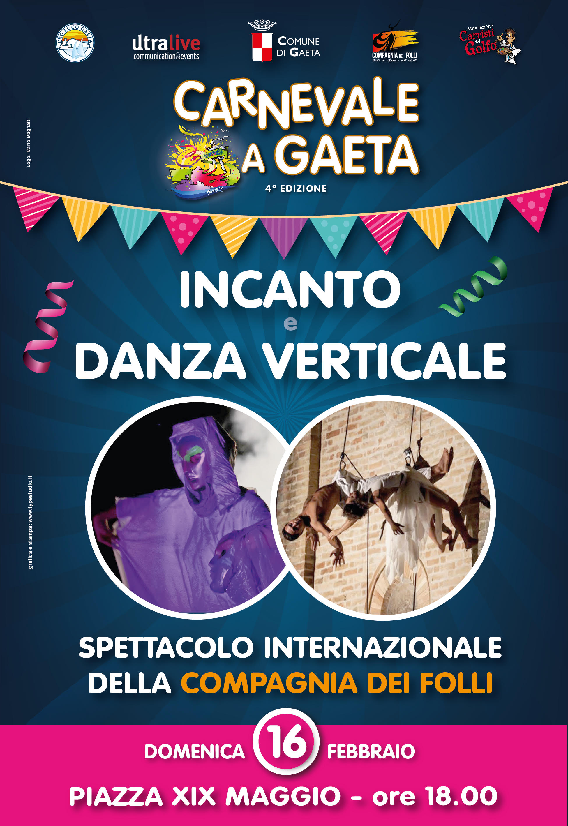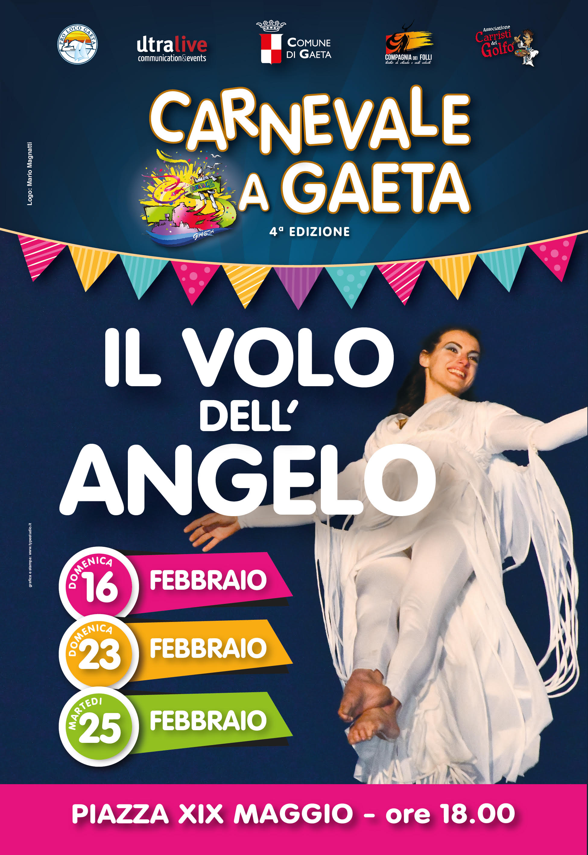 diventare un punto di forza attrattivo per il golfo. Carri allegorici, gruppi mascherati, spettacoli di danza animeranno queste tre domeniche. Dal 16 al 25 febbraio alle ore 17.30 I colori del Carnevale animeranno piazze e vicoli di Gaeta con proiezioni artistiche. Avrete la possibilità di scoprire la Storia di Pulcinella a Gaeta e coniugare l’aspetto ludico con quello culturale del Carnevale. Ci sarà poi il volo dell’Angelo dal Campanile, un evento davvero emozionante”. Il presidente della ProLoco, Antonio Donati, ha evidenziato l’impegno profuso sul territorio affinché “chiunque arrivi per il Carnevale possa trovare informazioni ma anche strutture recettive pronte ad accoglierlo”.