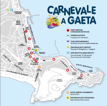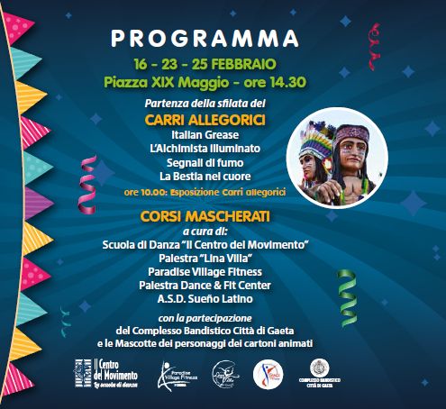 Tappa obbligatoria a Gaeta il 16, 23 e 25 febbraio con carri allegorici, gruppi mascherati, spettacoli di danza che animeranno queste due domeniche carnevalesche e martedì grasso.