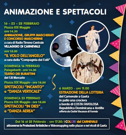 Carri, eventi colorati, costumi, sfilate per le vie della cittadina. Tanti gli appuntamenti da non perdere anche quest’anno, pronti a coinvolgere grandi e bambini, a suscitare stupore nei più piccoli e a far tornare piccoli anche i più grandi. Un Carnevale che sarà all’insegna del divertimento per i piccoli ma anche per gli adulti che potranno gareggiare al concorso della maschera più bella. Un ampio spazio dedicato ai bambini oltre a proiezioni artistiche e videomapping. Ci sarà la possibilità di scoprire la Storia di Pulcinella e Zi Nicole a Gaeta e coniugare l’aspetto ludico con quello culturale del Carnevale. Attesissimo, infine, il volo dell’Angelo dal Campanile del Comune.