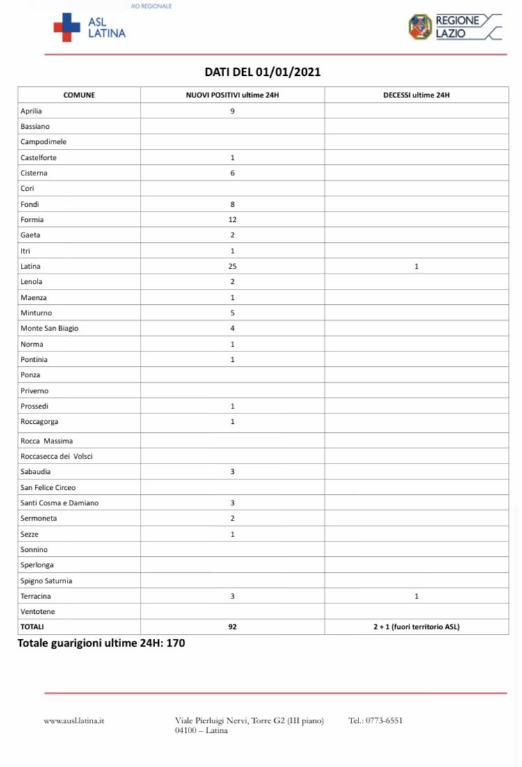 Covid, 105 nuovi positivi e 2 decessi in provincia di Latina