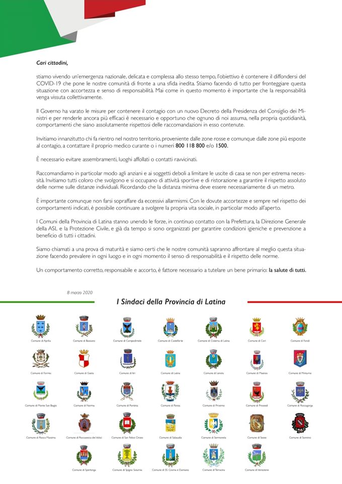 Emergenza Coronavirus, l’appello dei Sindaci della provincia di Latina