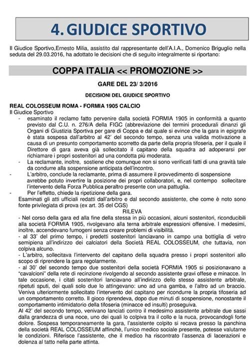 Coppa Italia: Colosseum-Formia si rigioca. Il Giudice Sportivo riconosce l’errore dell’arbitro