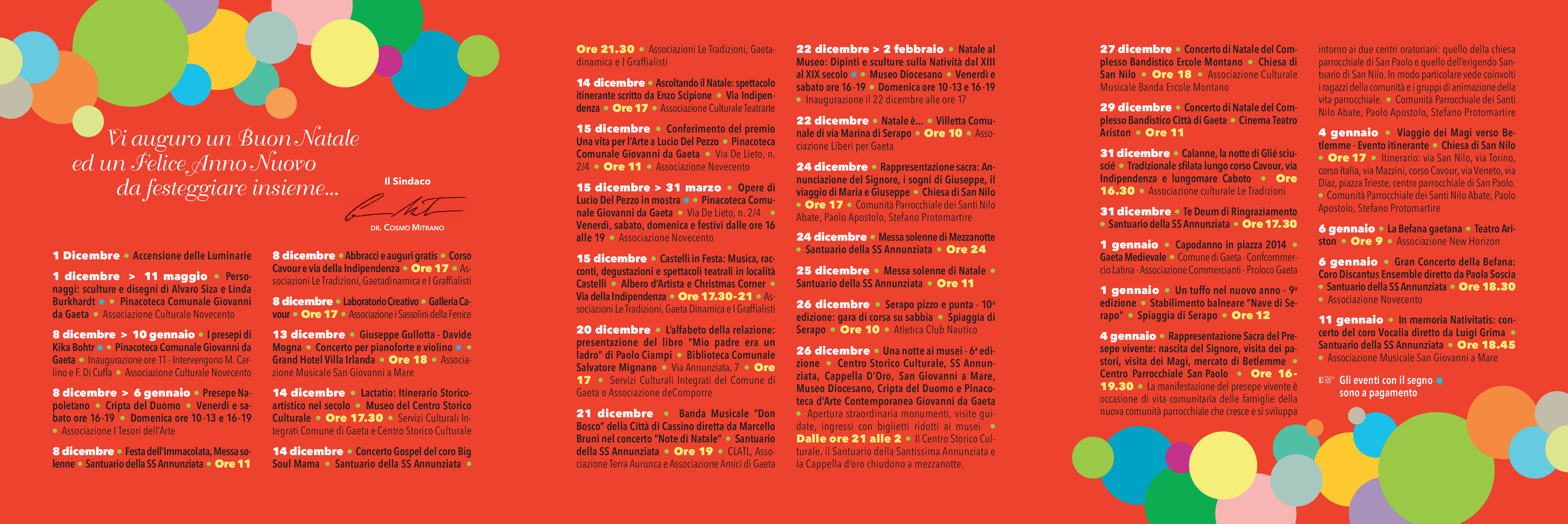 “Entriamo nel vivo degli eventi natalizi 2013 a Gaeta – dichiara il Sindaco Cosmo Mitrano – Tra mille difficoltà siamo riusciti anche quest’anno a proporre un calendario vario, in grado di soddisfare interessi e generazioni diverse, risultato di un lavoro sinergico tra Comune, IPAB, Pro loco e Associazioni. Il tutto circondato dalle suggestive luci di Natale, diffuse lungo le principali vie della città, a creare un clima ancora più festoso e natalizio. Un percorso luminoso fatto di renne, Re Magi e cammelli, che culmina in Piazza della Libertà con la Natività, realizzato grazie anche al contributo di imprenditori e commercianti. Il Natale 2013 a Gaeta con Mostre, Concerti, Gospel, Teatro itinerante, Festival de Glie Sciusce gaetano, vuole essere non solo il modo per festeggiare tutti insieme il momento più bello del calendario cristiano, ma anche un incoraggiamento alla ripresa della nostra città. Una sfida alla crisi che possiamo superare, se crediamo in modo fermo nelle potenzialità economiche e sociali di Gaeta”.