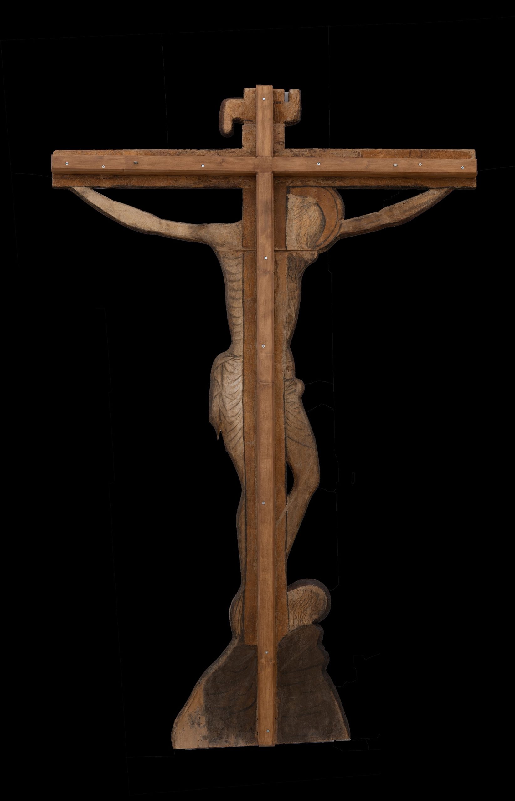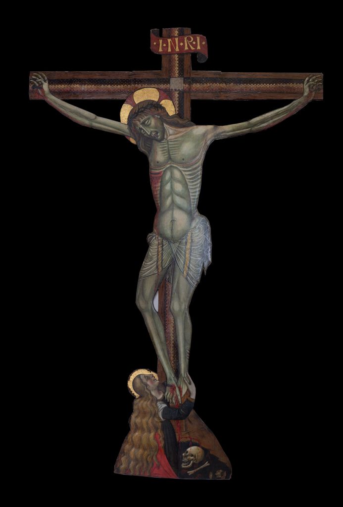 La croce, sagomata e dipinta sul recto e sul verso, databile attorno al 1460, rappresenta il Cristo Crocifisso con la Maddalena ai piedi della Croce ed è eseguita a tempera e oro su tavola. Il soggetto rientra pienamente nella tipologia del crocifisso gotico-doloroso: si tratta di un’iconografia trecentesca, incentrata sulle componenti più drammatiche e patetiche dell’episodio anche grazie all’approfondimento del tema nell’ambito dei testi apocrifi e delle sacre rappresentazioni teatrali, che trovava ancora diffusione nella metà del XV secolo. L’autore dell’opera è stato identificato da Federico Zeri come “maestro del 1456”, responsabile del trittico con l’“Incoronazione della Vergine” eseguito in quella data e all’epoca conservato nella chiesa gaetana di Santa Lucia (già Santa Maria in Pensulis), il medesimo edificio di culto da cui proviene la croce dipinta. Entrambe le opere sono entrate a far parte delle raccolte del Museo Diocesano di Gaeta. Successivamente l’anonimo pittore individuato da Federico Zeri è stato identificato come Giovanni da Gaeta, un artista proveniente dal milieu napoletano-aragonese, formatosi a contatto con Leonardo da Besozzo nel cantiere della Chiesa di San Giovanni a Carbonara, e il cui linguaggio fu in seguito arricchito da esperienze umbro-marchigiane e ispano-catalane.