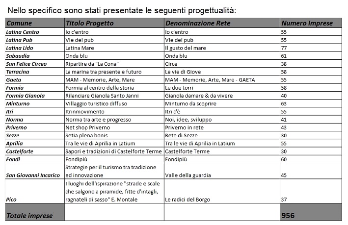 Confcommercio Imprese per l’Italia-Lazio Sud e il CAT Confcommercio Latina SCARL, hanno raggiunto, in tal senso, un grande obiettivo: sono stati presentati 19 progetti, in 16 Comuni per un totale di 956 imprese coinvolte.