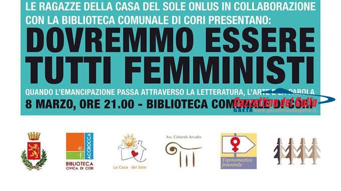 In occasione della Giornata Internazionale della Donna, giovedì 8 Marzo, alle ore 21:00, presso la Biblioteca Comunale di Cori (LT) “Elio Filippo Accrocca”, in vicolo Macari, si terrà l’iniziativa “Dovremmo essere tutti femministi. Quando l’emancipazione passa attraverso la letteratura, l’arte e la parola”, organizzata da “La Casa Del Sole” Onlus, in collaborazione con le associazioni culturali “Arcadia”, “Toponomastica Femminile” e “Chi Dice Donna”, patrocinata dal Comune di Cori.