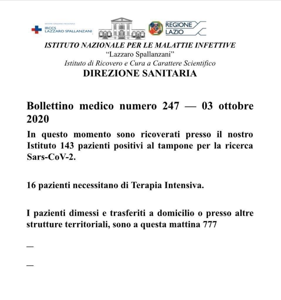 Coronavirus, L’INMI Spallanzani ha diramato il bollettino medico n. 247 del 3 ottobre