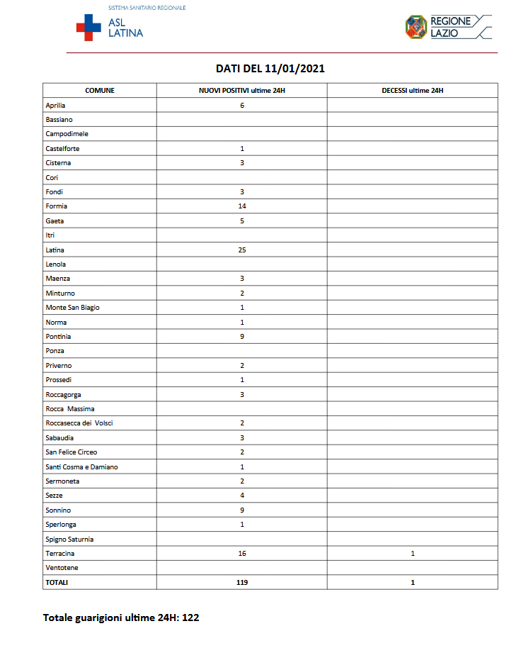 Covid, 119 nuovi positivi e 1 decesso in provincia 11 Gennaio 2021 di redazione Covid-19, il bollettino Asl dell’11 gennaio registra 119 nuovi positivi e 1 decesso in provincia di Latina. 122 i guariti nelle ultime 24 ore.