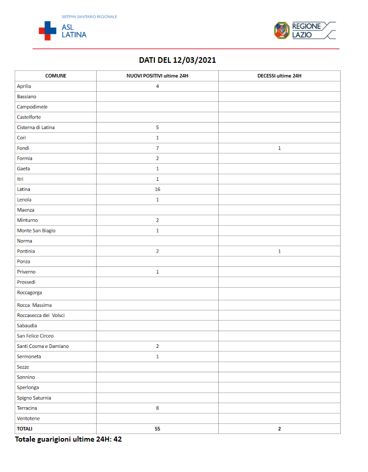 Covid-19, bollettino del 12 marzo: In provincia 55 nuovi casi e 2 decessi 12 Marzo 2021 di redazione Covid-19, nel bollettino del 12 marzo si registrano in provincia di Latina 55 nuovi casi e 2 decessi nelle ultime 24 ore
