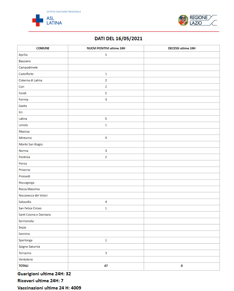 Covid nel bollettino del 16 maggio della ASl di Latina si registrano 47 nuovi casi e nessun decesso in provincia di Latina.