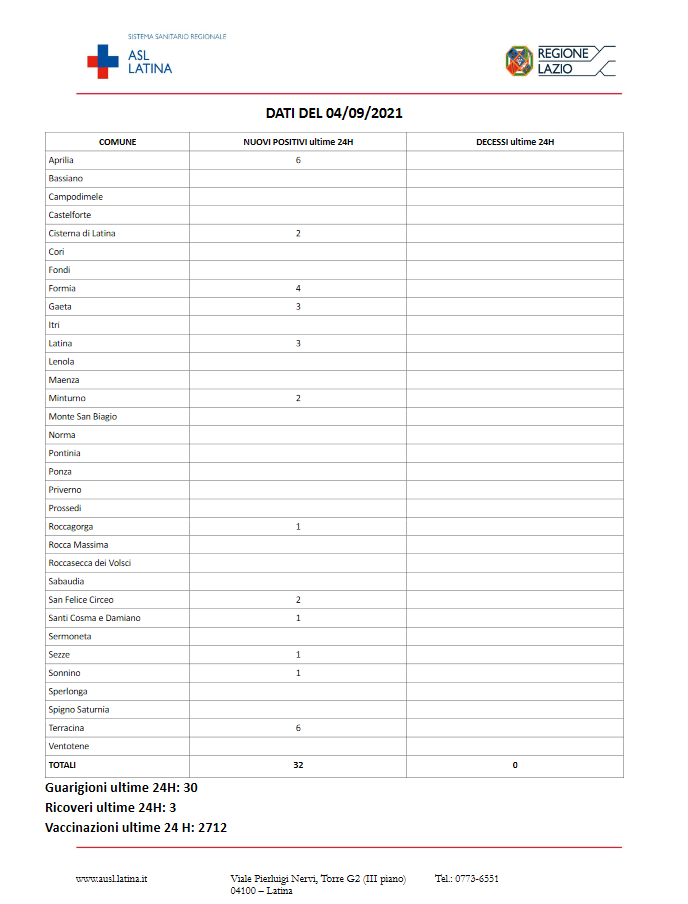 Covid, bollettino 4 settembre: 32 nuovi casi in provincia 4 Settembre 2021 di redazione Covid, nel bollettino ASL del 4 settembre si registrano 32 nuovi casi in provincia di Latina.
