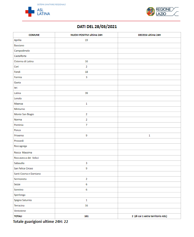 Covid%2C+bollettino+Asl+Latina+del+28+marzo%3A+161+nuovi+casi+e+2+decessi
