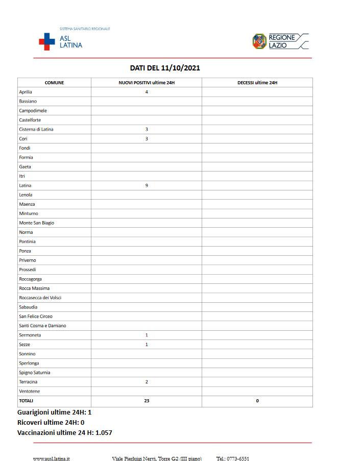 Covid, bollettino del 11 ottobre: 23 nuovi casi in provincia 11 Ottobre 2021 di redazione Covid, nel bollettino ASL del 11 ottobre si registrano 23 nuovi casi in provincia di Latina.