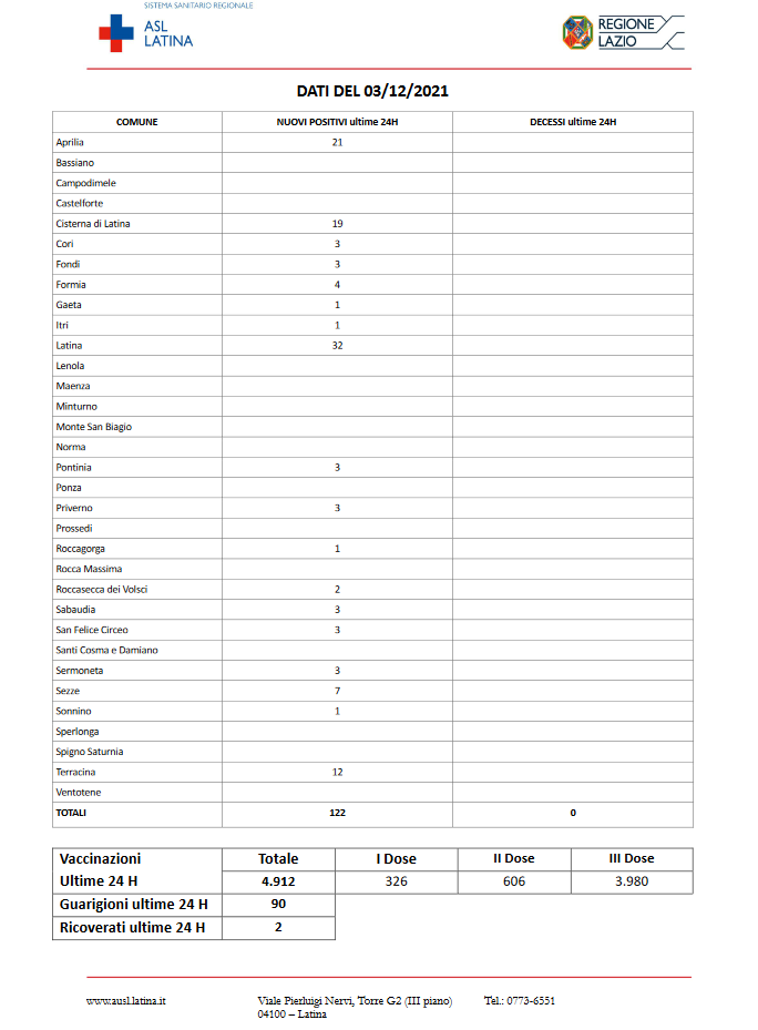 Covid in provincia, bollettino 3 dicembre 3 Dicembre 2021 di redazione Covid, nel bollettino ASL del 3 dicembre si registrano 122 nuovi casi in provincia di Latina. Covid in provincia, bollettino ASL 2 dicembre