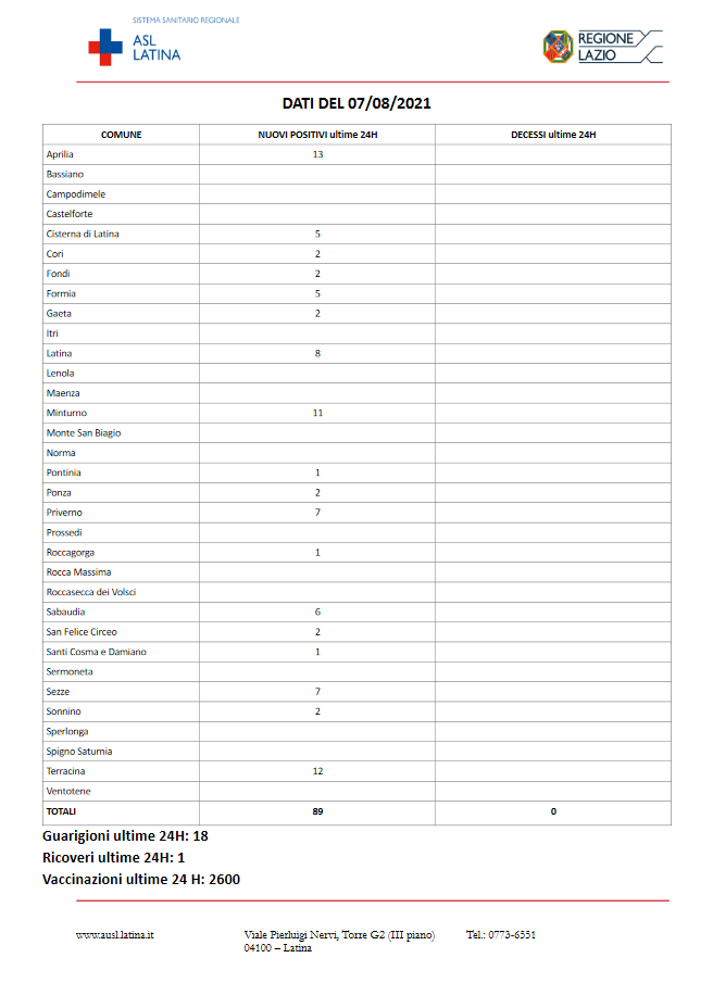 nella Asl di Latina si registrano 89 nuovi casi e si tratta di casi isolati a domicilio o con link familiare o contatto di un caso già noto. si registrano 0 decessi.