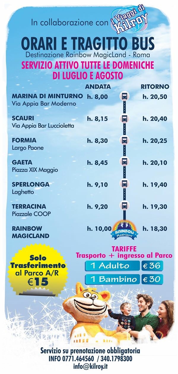 Anche il Sud Pontino avrà un servizio navetta che collegherà Marina di Minturno – Scauri – Formia – Gaeta – Sperlonga e Terracina con il parco di divertimenti Rainbow Magicland Valmontone. L’iniziativa intrapresa dal Direttore Commerciale Massimo Zanon in collaborazione con I Viaggi di Kilroy, permetterà lo svolgimento di tale servizio per tutte le domeniche di luglio e agosto. Il solo ingresso al parco ha un costo di € 35 per gli adulti e di € 29 per i bambini, con un simbolico € 1 in più è possibile usufruire del servizio navetta andata e ritorno.