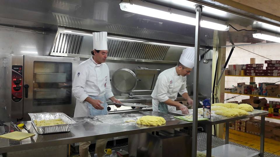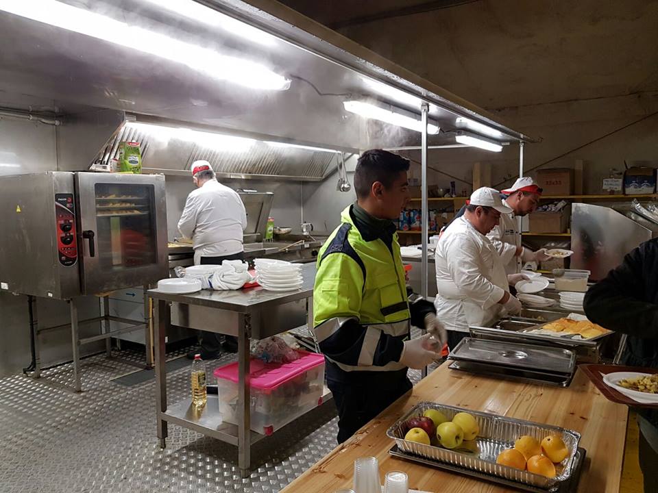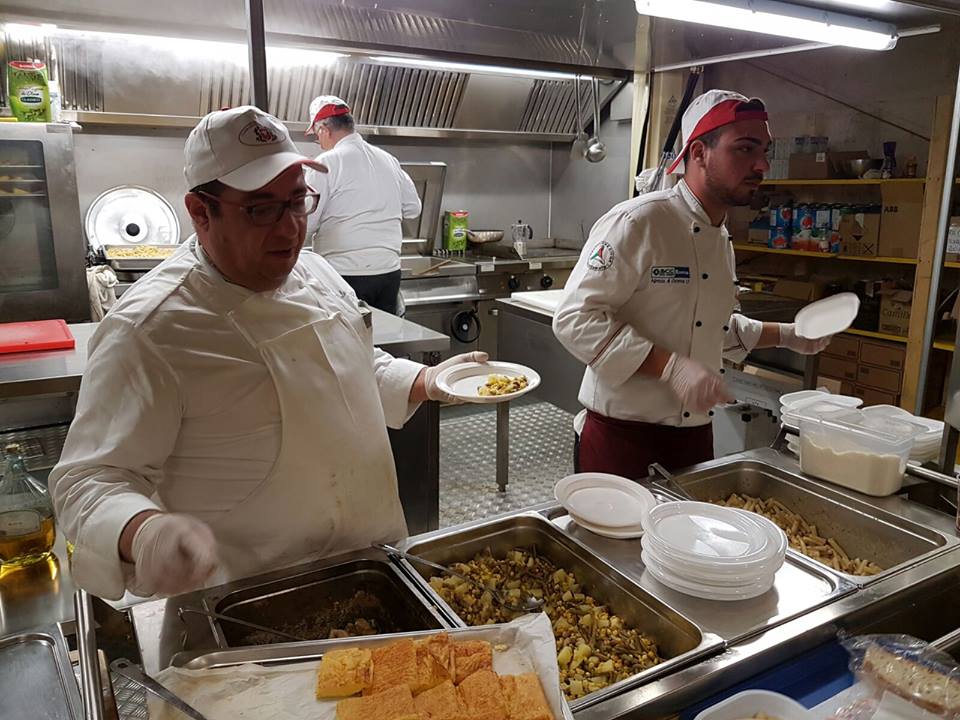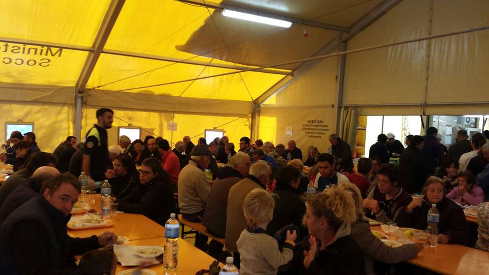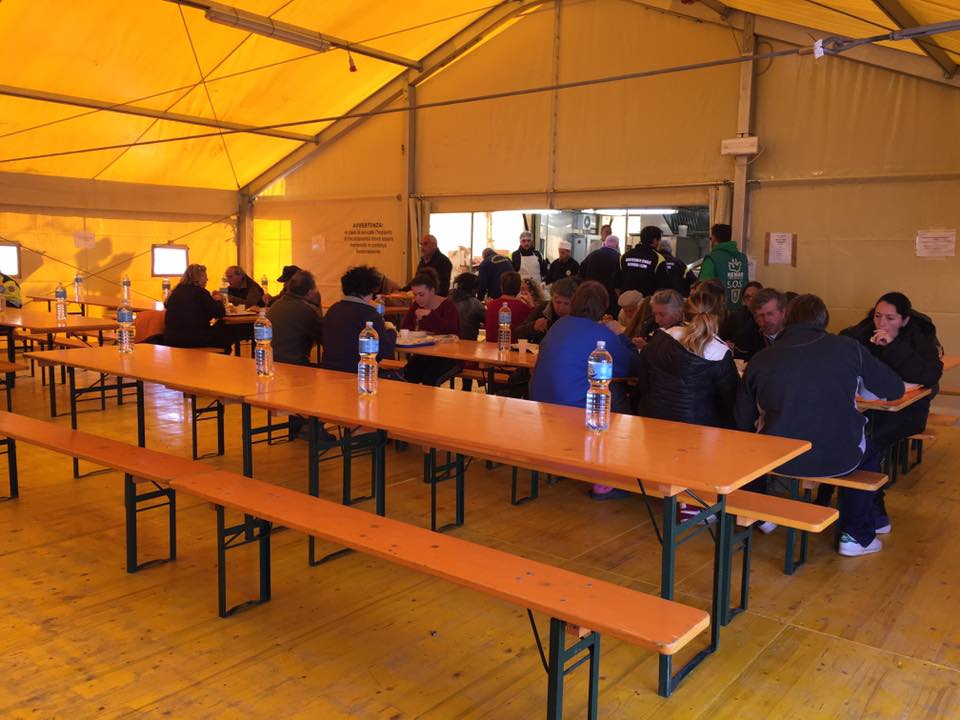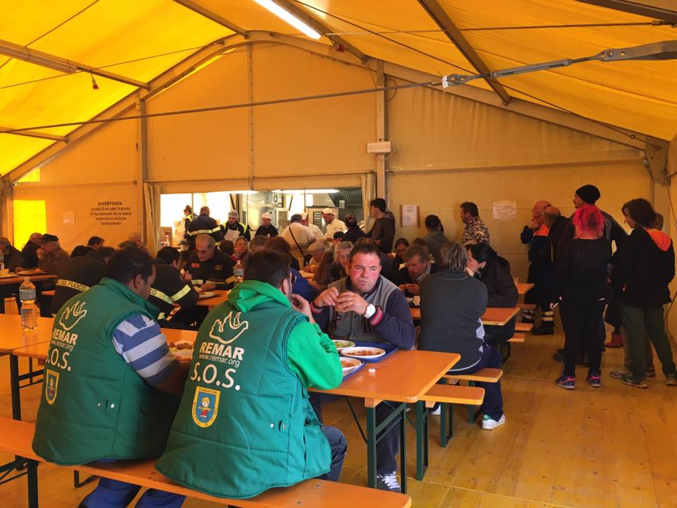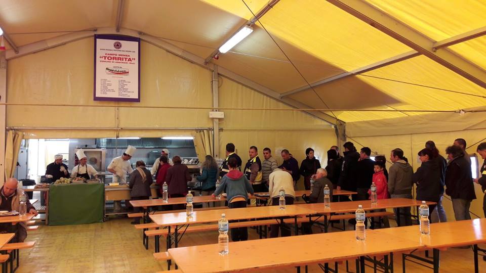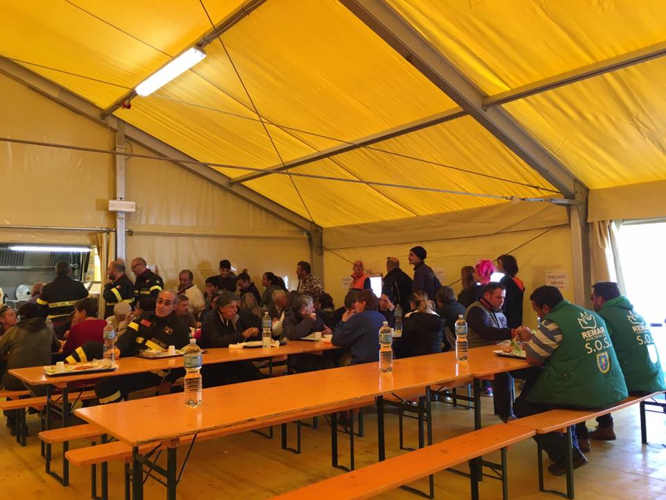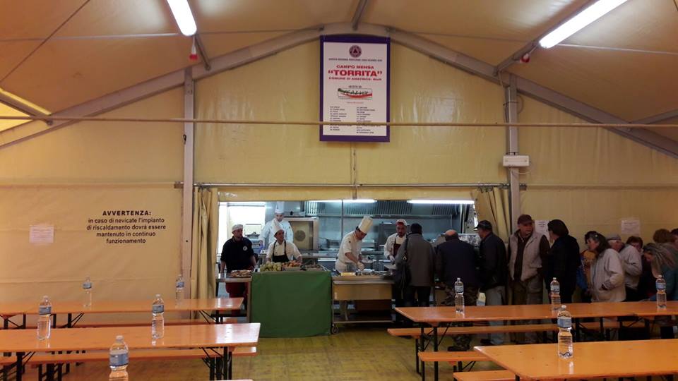 Già dalla scorsa domenica la mensa ha servito un pasto caldo a più di 100 persone. Da lunedì, tra pranzo e cena, i pasti giornalieri sono saliti a 450, divisi tra popolazione, volontari e soccorritori. La gestione della cucina è stata affidata alla Federazione Italiana Cuochi con a capo lo chef Roberto Rosati. I cuochi impegnati provengono da tutta Italia. In questa prima settimana ha lavorato uno staff di cuochi abruzzesi che si è dato il cambio con un team proveniente dalla Toscana. La tensostruttura realizzata per ospitare la mensa è interamente riscaldata e si è presto trasformata in un punto di ritrovo per gli sfollati. Resterà attiva fin quando non cesserà l’emergenza.