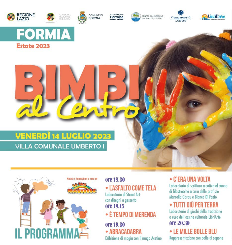 BIMBI IN CENTRO – “Attività e Spettacoli per i più Piccoli” – bimbi, in un ambiente incantato tra maghi, giocolieri e mangiafuoco saranno accompagnati da artisti “madonnari” nella creazione dei loro quadri di asfalto con la tecnica dei gessetti . Non mancherà la merenda per tutti;