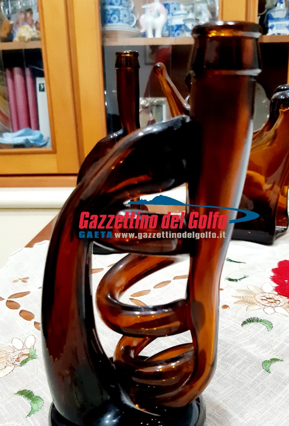 Souvenir o meglio, pezzi di storia: “si tratta di bottiglie prese prima che la pallina del vetro caldo andasse in rifinitura. Queste palline andavano prima negli abbozzatori e poi passavano automaticamente nel finitore, gonfiato con aria compressa. Quando qualcuno voleva divertirsi o aveva tempo da perdere, prelevava la pallina prima della rifinitura e si sfiziava a fare questa invenzioni. Dopodiché andava negli stampi ed uscivano questi souvenir. Facevamo anche portacarte e posaceneri”.