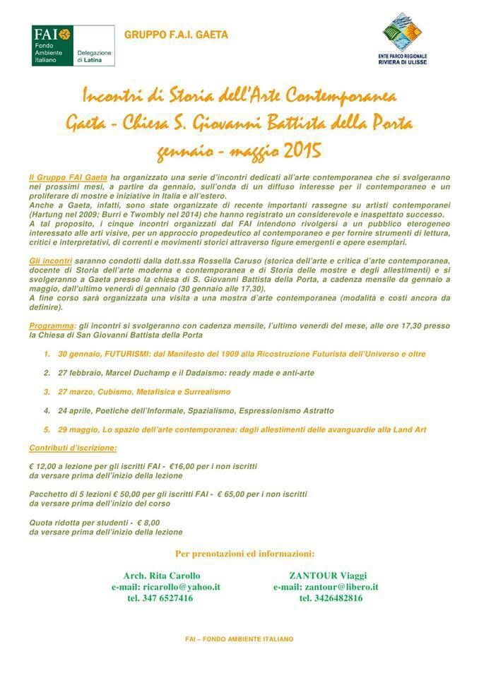 Un’iniziativa della Delegazione Fai di Latina e il Gruppo Fai di Gaeta darà vita, partire da venerdì 30 gennaio alle 17.30, a cinque incontri tenuti dalla dott.ssa Rossella Caruso dal tema “Futurismi: dal Manifesto del 1909 alla Ricostruzione futurista dell’universo e oltre”.