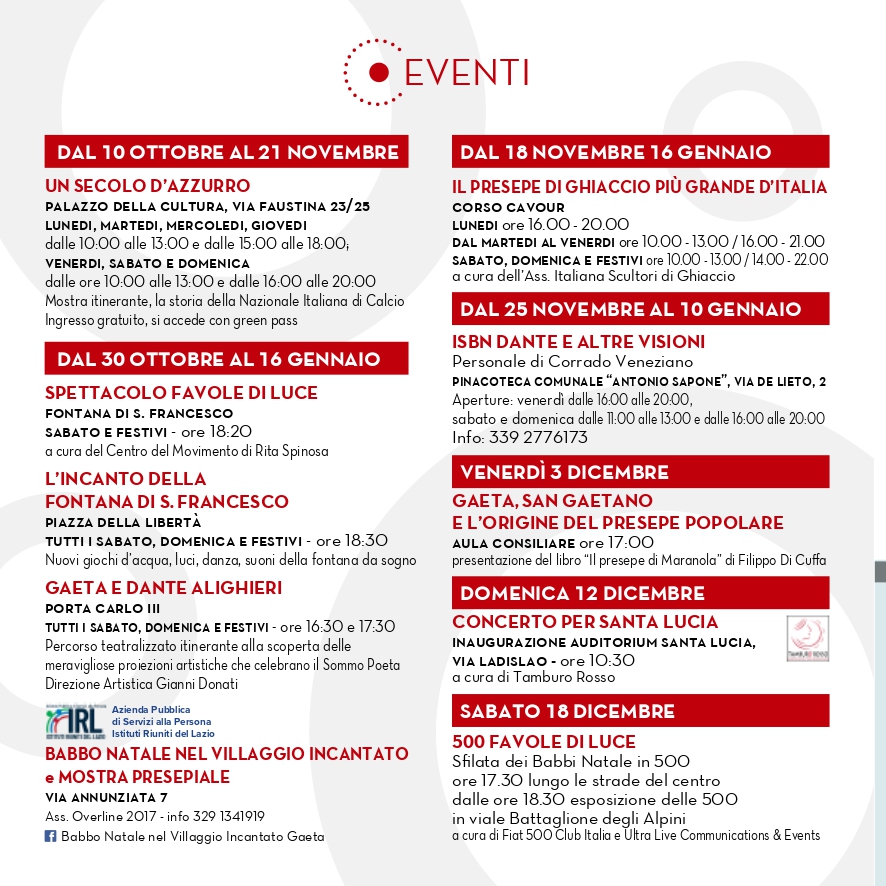 500 “Favole Di Luce sfilata dei Babbo Natale in 500”, ore 17:30lungo le strade del centro dalle 18:30 esposizione delle 500 in viale Battaglione degli Alpini a cura di Fiat 500 Club Italia eUltra Live Communications & Events.