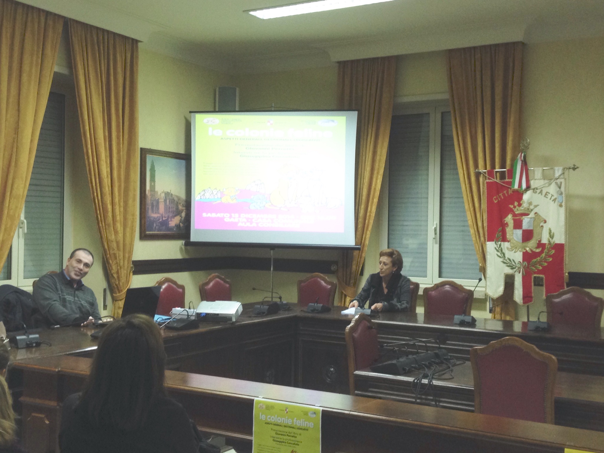 La convenction ha visto la presentazione del saggio intitolato “Le colonie Felune”, autore Perretta. È intervenuta la prof.ssa Giuseppina Coccoluto, presidente dell’Associazione A.D.A Gaeta, che opera sul territorio di Gaeta dal 2003. In questi anni i volontari dell’associazione hanno lavorato incessantemente per combattere il fenomeno del randagismo sia canino che felino. Sono molte centinaia i cani e i gatti raccolti, curati e dati in adozione.