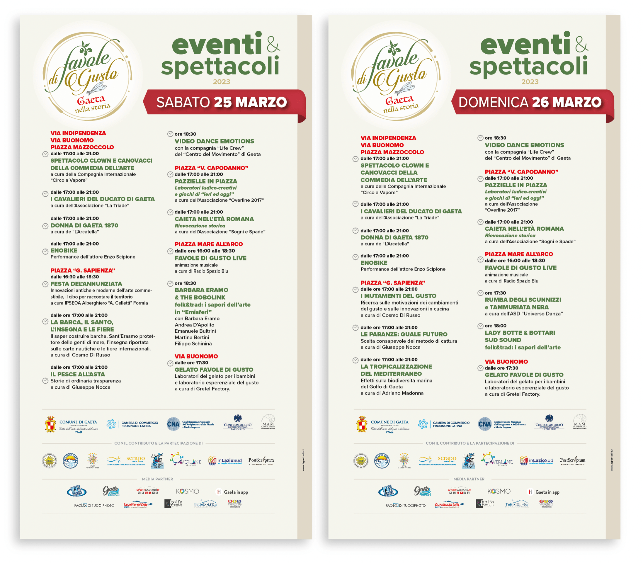 L’iniziativa, organizzata dal Comune di Gaeta, con il patrocinio e contributo dalla Camera di Commercio Latina-Frosinone, condivisa con Confcommercio Imprese per l’Italia Lazio Sud, CNA Latina Confederazione Nazionale dell’Artigianato e della Piccola e Media Impresa, Consorzio MAM Memoria, Arte, Mare – Gaeta, in collaborazione con Pro Loco Gaeta, Università degli Studi di Cassino e del Lazio Meridionale, Istituto Professionale per i Servizi Enogastronomici e per l’Ospitalità Alberghiera “Angelo Celletti” di Formia e Associazione Provinciale Cuochi di Latina, inebrierà ancora per due giorni via Indipendenza e le piazzette del Borgo, con profumi e sapori, musica, spettacoli itineranti, percorsi esperienziali, attività ludiche e laboratori creativi per grandi e piccini.