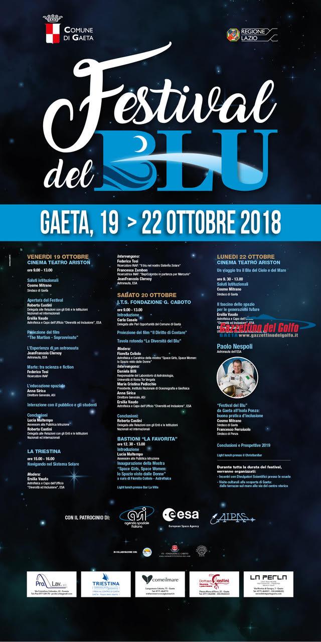 Precisa invece la promotrice del “Festival del Blu” la Delegata del Sindaco ai rapporti con gli Enti e le Istituzioni Nazionali e Internazionali Roberta Castini “sarà un’originale miscela di appuntamenti all’insegna della cultura scientifica e tecnologica, che mira a focalizzare l’importanza dello spazio per la protezione del nostro pianeta con particolare interesse alla salvaguardia dell’ambiente del mare non trascurando l’aspetto favoloso della magia e della poesia della musica dello spazio. Gaeta è un luogo magico avvolto da un orizzonte che separa il cielo dal mare. Per quattro giorni questa linea di confine si dissolverà in un unico grande blu tema del primo Festival. In questi giorni scienziati, poeti, studenti e gente comune si ritroveranno assieme per effettuare un viaggio emozionante. La dimensione del blu che ci proietta nel futuro sarà il filo conduttore attorno a cui raccontare questo viaggio al pubblico e ai ragazzi in particolare, perché il futuro parte da qua”.