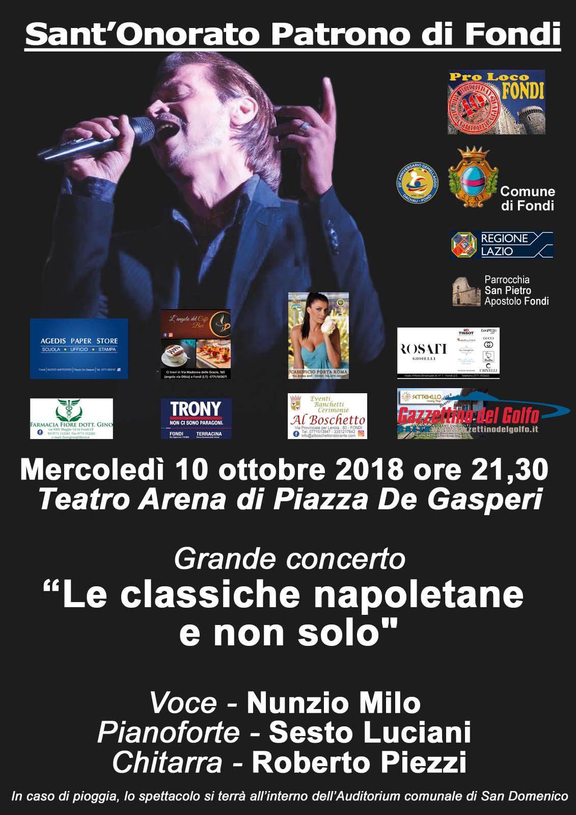 La Pro Loco di Fondi, in sintonia con la parrocchia di San Pietro e l’Amministrazione comunale, con il patrocinio della Regione Lazio, organizza un grande concerto gratuito la sera di mercoledì 10 ottobre 2018 alle ore 21,30 al Teatro all’aperto di Piazza de Gasperi.