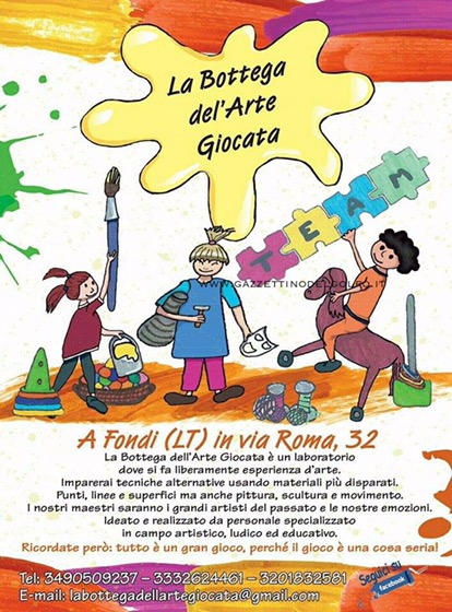 “La bottega dell’arte giocata” è il nome scelto dalla Dott.essa Maria Ilaria D’Andrea e dal Dott. Carlo Zarone per il loro nuovo progetto che coniuga arte e bambini ormai giunto sulla linea di partenza. Sarà presentato, infatti, insieme al nuovo studio di ri-abilitazione pediatrica, sabato 28 maggio, in occasione di un seminario dal titolo “I disturbi del neurosviluppo dopo la diagnosi, trattamento ri-abilitativo ed educativo”, che prenderà il via alle 9.30, proprio presso i locali di via Roma, a Fondi, dove entrambi avranno sede.