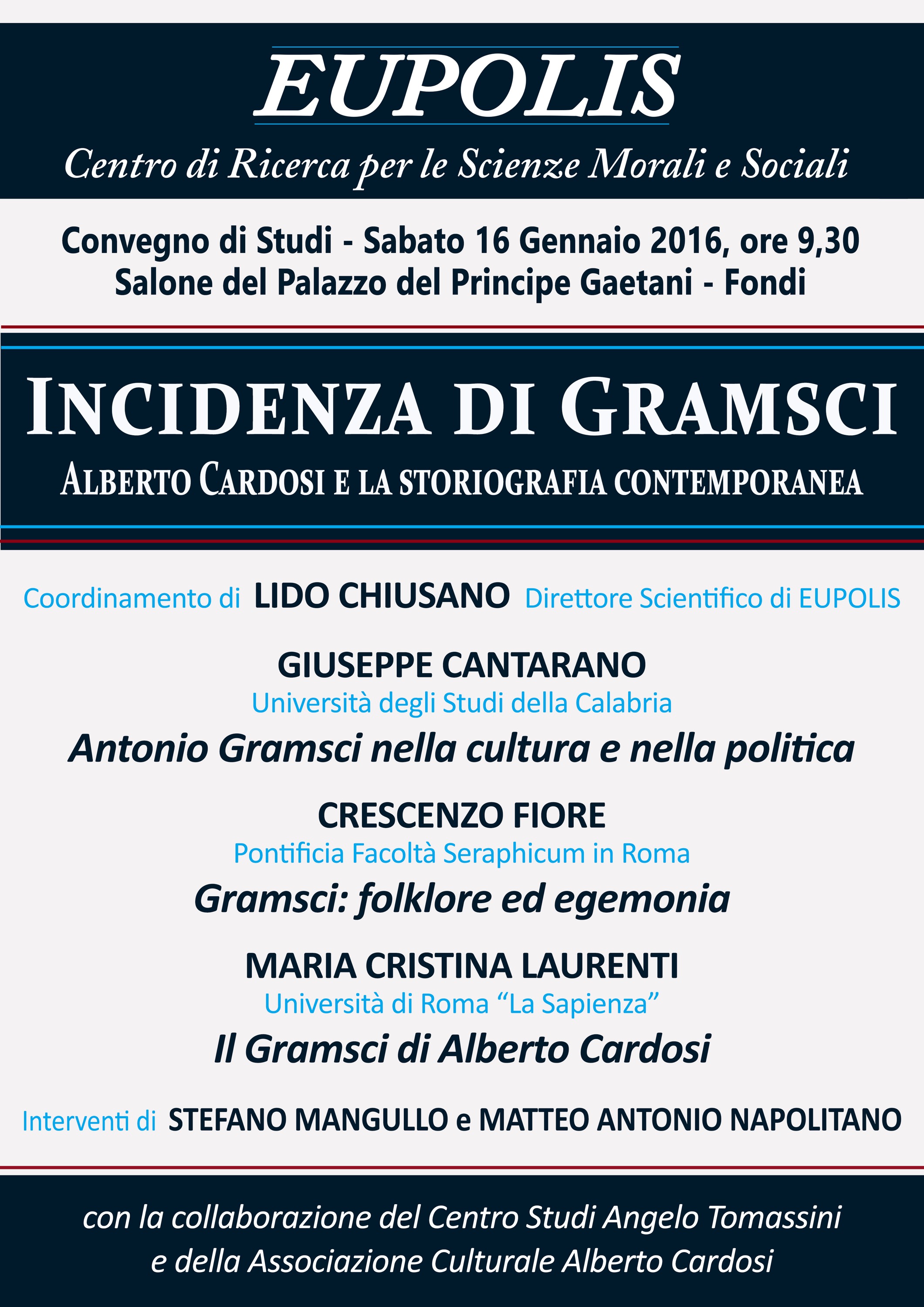 Il Centro di Ricerca per le Scienze Morali e Sociali Eupolis, con la collaborazione del Centro Studi Angelo Tomassini e dell’Associazione Culturale Alberto Cardosi, promuove un Convegno di Studi a Fondi, sabato 16 Gennaio 2016, ore 9:30, nel Salone del Palazzo del Principe Gaetani. Vi si parlerà della “INCIDENZA DI GRAMSCI. Alberto Cardosi e la storiografia contemporanea”. Il coordinamento è di Lido Chiusano, con i seguenti relatori: Giuseppe Cantarano (Università degli Studi della Calabria) “Antonio Gramsci nella cultura e nella politica”, Crescenzo Fiore (Pontificia Facoltà Seraphicum) “Gramsci: folklore ed egemonia”, Maria Cristina Laurenti (Università di Roma La Sapienza) “Il Gramsci di Alberto Cardosi”; Comunicazioni di Stefano Mangullo e Matteo Antonio Napolitano. Nel Convegno s’intende proporre una ricognizione delle ragioni dell’attualità di Antonio Gramsci, uno degli autori italiani oggi più studiati al mondo; s’intende anche lumeggiare, all’interno della copiosa letteratura di argomento gramsciano, il contributo d’un giovane studioso pontino prematuramente scomparso: Alberto Cardosi.
