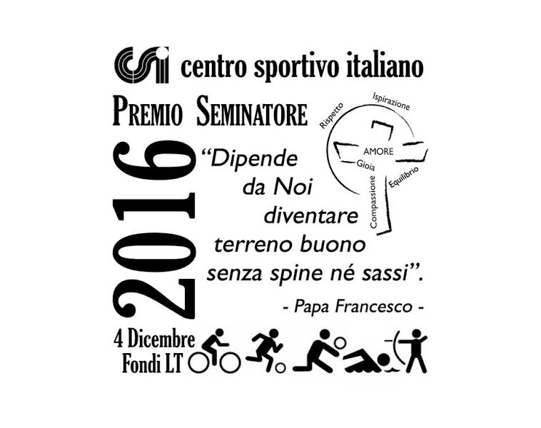 Nell’ambito delle attività portate avanti dal CSI (Centro Sportivo Italiano) della provincia di Latina, un momento particolare è rappresentato dalla giornata dedicata al “Premio Seminatore”. Nel darne notizia, il dott. Alfonso Artone, vicepresidente provinciale del Centro che promuove lo sport dilettantistico e teso all’aggregazione tra i giovani, precisa il programma della manifestazione che si svolgerà, domenica 4 dicembre, presso la parrocchia San Paolo apostolo, sita in via Lazio 10, a Fondi. “Sarà un pomeriggio associativo –sottolinea il dott. Artone- in cui, tra i vari momenti, vi sarà la premiazione del “Seminatore 2016”. Nel corso dell’incontro interverranno rappresentanti dei vari media, delle istituzioni, del mondo dell’associazionismo e del clero. Significativa la presenza, tra i partecipanti, del vescovo di Gaeta, mons. Luigi Vari, a conferma della vocazione pedagogicamente formativa, tramite la disciplina sportiva, svolta dal Centro Sportivo Italiano”. Subito di seguito il programma della giornata: ore 14.40, accredito arbitri; ore 15.00, accredito dirigenti, atleti, genitori; ore 18.30, Santa Messa.