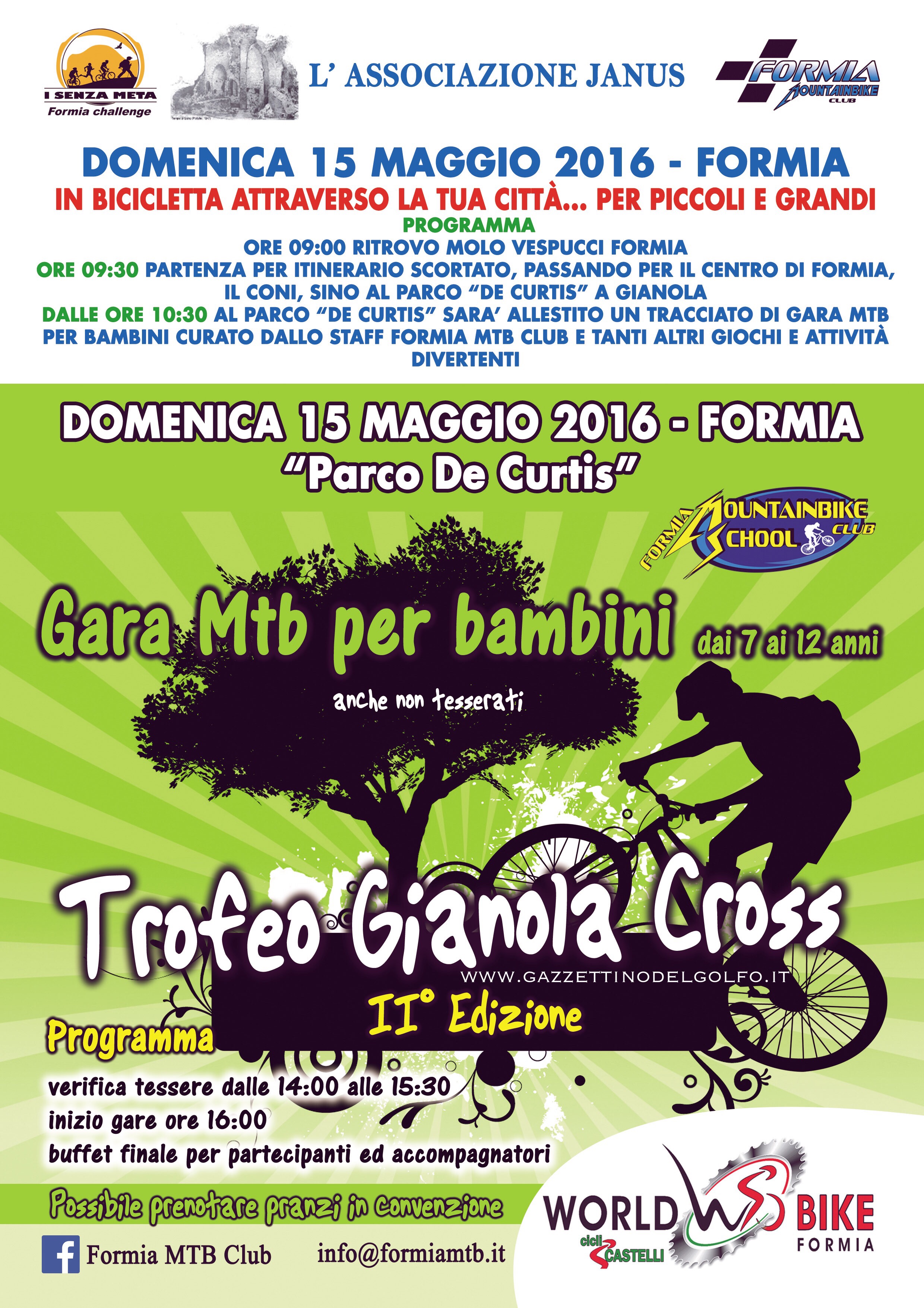 A partire dalle ore 15:00 nel Parco De Curtis si svolgerà il “II Trofeo Gianola Cross”, gare agonistiche di MTB per i Bambini dai 7 ai 12 anni affiliati alla Federazione Ciclistica Italiana. Al termine delle gare Ufficiali ci sarà una gara PROMOZIONALE aperta a tutti i bambini non tesserati.