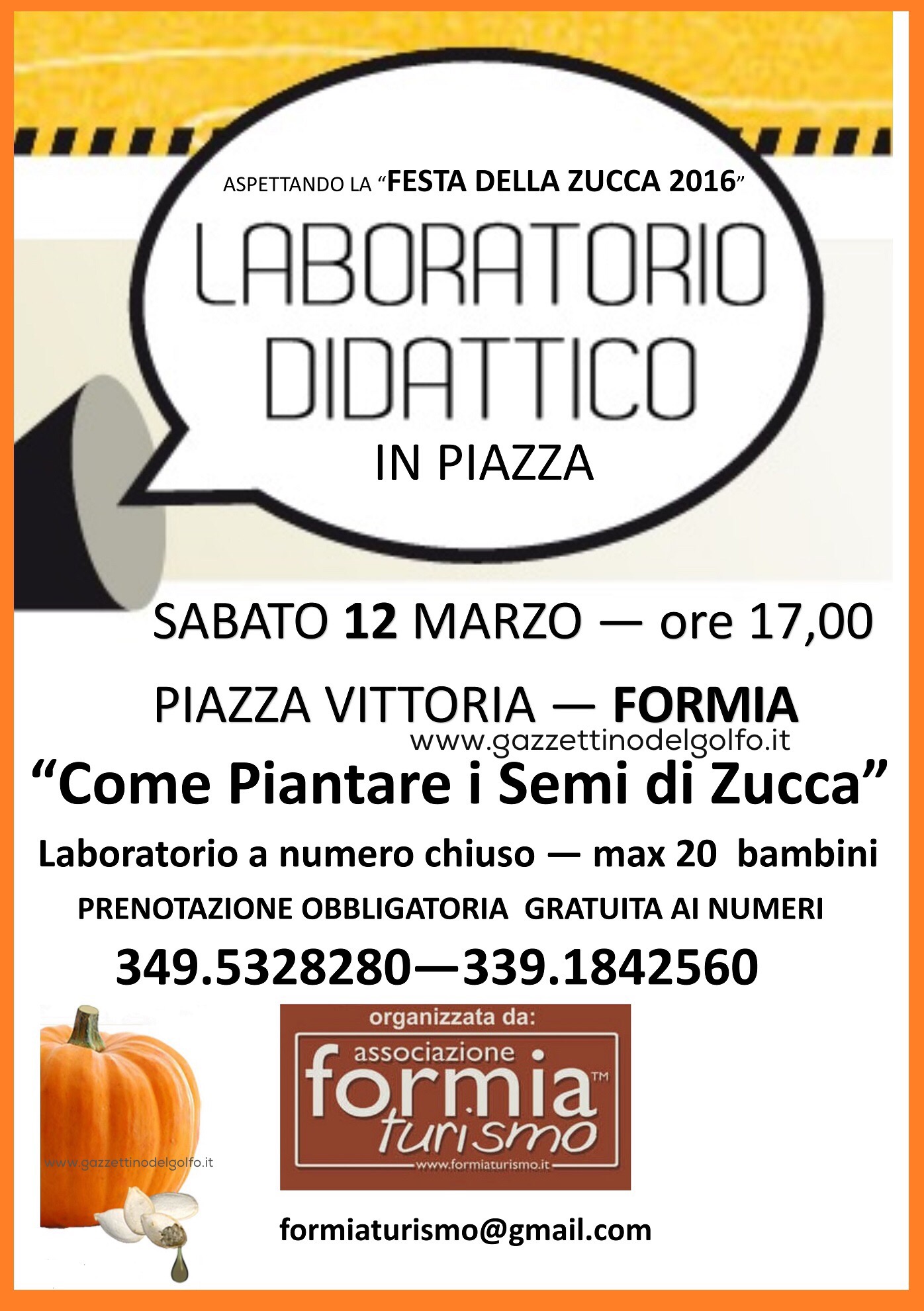 L’Associazione Formia Turismo ha pensato anche ai bambini. Dalle 17 alle 18 si terrà il laboratorio didattico “Come piantare i semi di Zucca” per massimo 20 ragazzi partecipanti, con prenotazione obbligatoria ai numeri 349.5328280 – 339.1842560. Continua l’impegno dell’associazione nella rivalutazione di questo prezioso alimento, elemento significativo della tradizione culinaria del territorio. La recente acquisizione del dominio www.festadellazucca.it consentirà un ulteriore incremento di visibilità ad una manifestazione già affermata nel sud pontino.