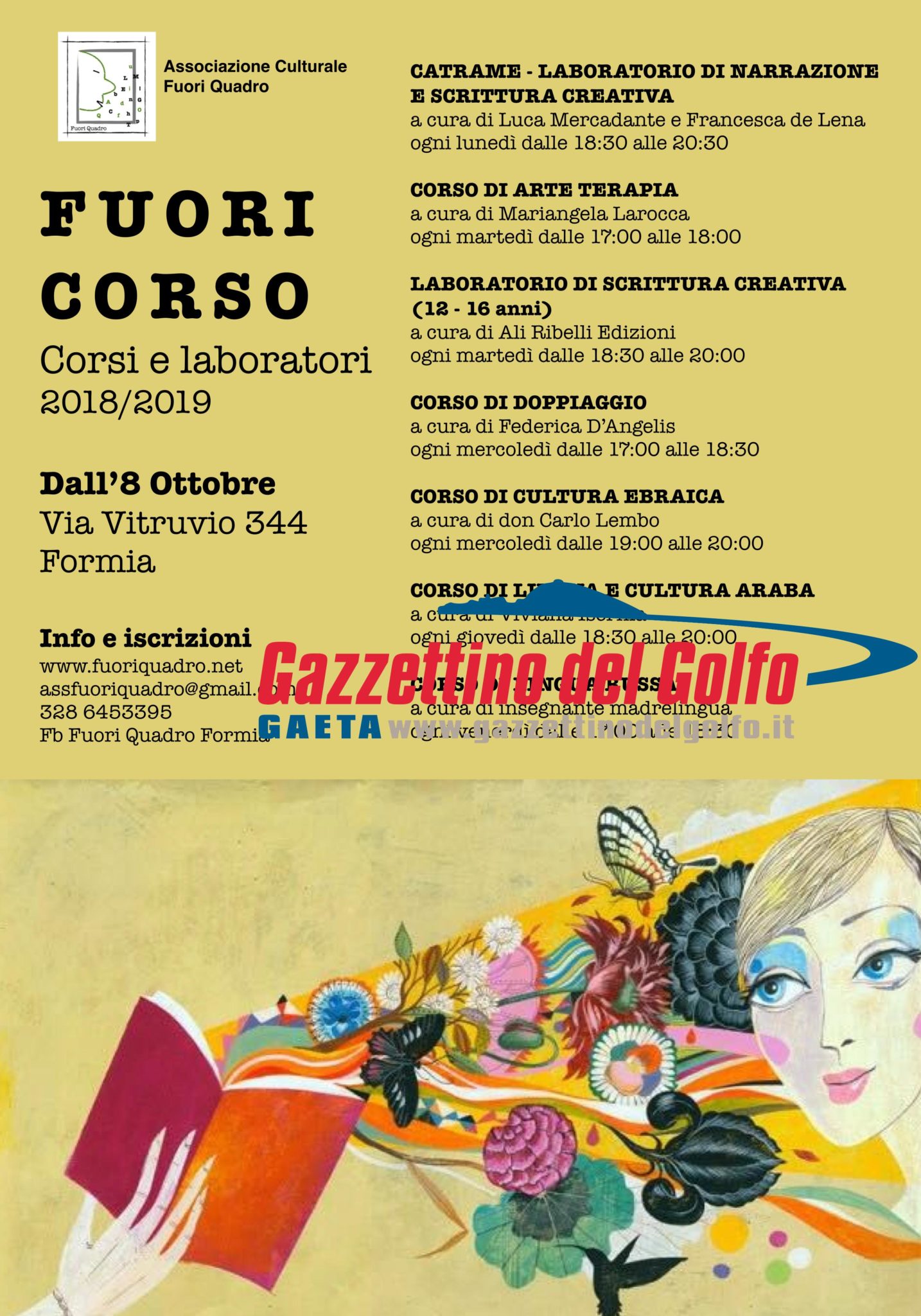 Aperte le iscrizioni per i “Fuori Corso” 2018/2019 promossi dall’associazione culturale Fuori Quadro presso la propria sede in via Vitruvio 344 a Formia. Un’offerta variegata di corsi per tutte le età. Dall’8 ottobre una settimana di prova gratuita per sperimentare con libertà i laboratori in programma.